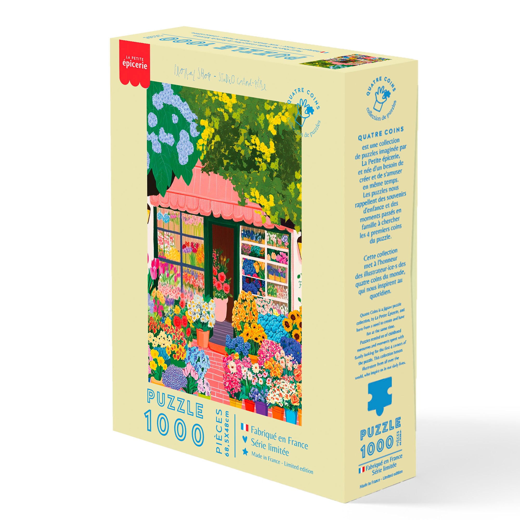 Plongez dans l’atmosphère joyeuse d’une boutique de fleurs en pleine effervescence avec Flower Shop, un puzzle 1000 pièces illustré par Studio Grand-Père. Derrière la vitrine, bouquets colorés et feuillages foisonnants composent une scène vivante, baignée de douceur et de poésie. Ce puzzle invite à prendre le temps, à savourer la beauté du quotidien et à s’évader au fil des pièces, comme une parenthèse fleurie au cœur de la ville.